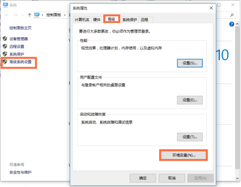 右击【计算机】,选择【属性】,进入系统页面,点击【高级系统设置】,然后进入系统属性页面,点击【高级】——【环境变量】,