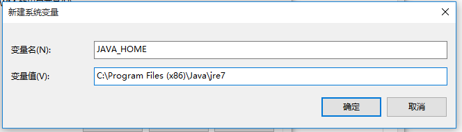如图,在【系统变量】下点击【新建】,弹出对话框,变量名为【JAVA_HOME】,变量值是指安装JDK的路径,小编安装在C:\Program Files (x86)\Java\jre7,点击确定,