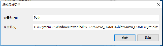 在系统变量中找到Path变量,进行编辑,弹出对话框,变量名为Path,在变量值中添加输入【;%JAVA_HOME%\bin;%JAVA_HOME%\jre\bin;】,