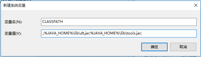 找到CLASSPATH,没有就要新建,变量名为CLASSPATH,变量值为【.;%JAVA_HOME%\lib\dt.jar;%JAVA_HOME%\lib\tools.jar; 】,点击确定,